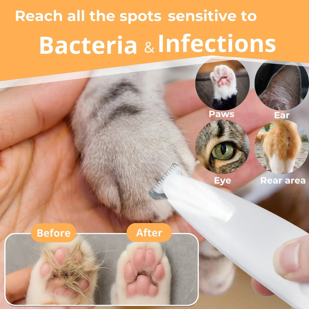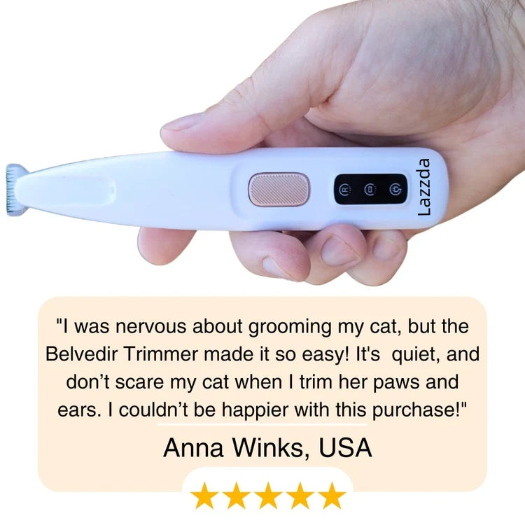 The Lazzda Cat Grooming Trimmer is specially designed for safe, easy, and stress-free grooming. Its low-noise motor operates at a cat-friendly frequency to keep your kitty calm, while the KittySkinSafe™ blade technology ensures precise trimming without the risk of nicks or cuts. Just turn it on, gently glide it along the fur—either in the direction of hair growth or against it depending on the area—and let it trim away tangles, debris, and excess fur. It's cordless, waterproof, and perfect for delicate zones like the paws and rear.