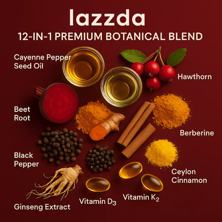 We understand the skepticism. Most supplements are underdosed with proprietary blends that hide how little active ingredient they actually contain. Lazzda is different: we use a premium 12-in-1 botanical blend with 300mg cayenne pepper seed oil, 100mg grape seed oil, 50mg curcumin, plus hawthorn berry, beet root, cinnamon, berberine, ginseng, and essential vitamins D3, K2, and E. These are research-backed ingredients in effective doses, not marketing hype. We target the root cause (restricted blood flow and arterial plaque) instead of just masking symptoms. This is why customers see measurable improvements in BP, performance, and energy, because we're giving your body what it actually needs to heal, in amounts that actually work.