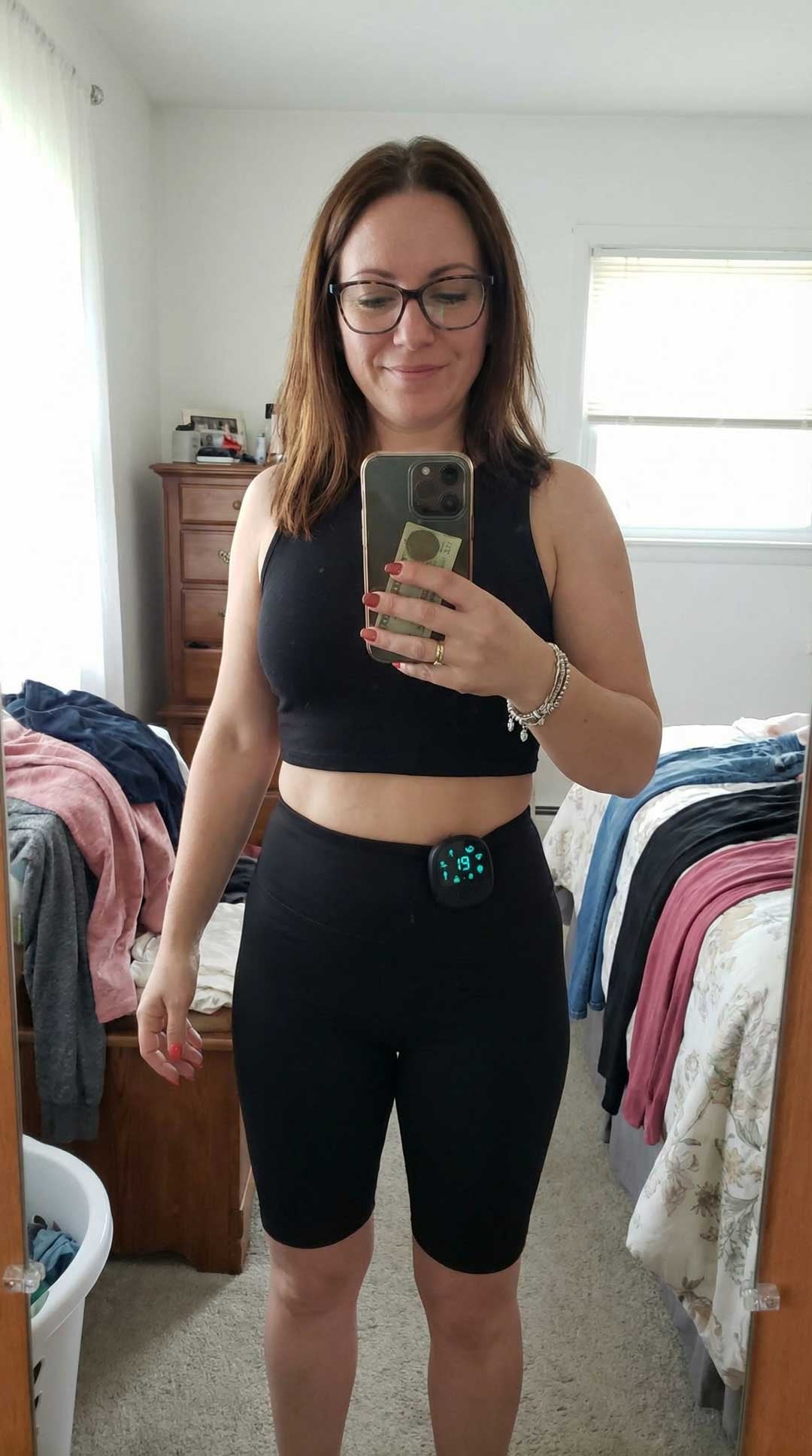 Integrated electrodes send controlled impulses to glutes, thighs, and hamstrings.